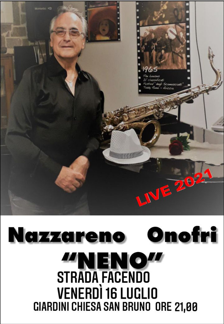 COLLEFERRO – È tutto pronto, nell’area adiacente alla Chiesa di San Bruno a Colleferro per il concerto live di Nazzareno (“Neno”) Onofri che torna a calcare la scena con il suo spettacolo musicale “Strada facendo – Live 2021”.