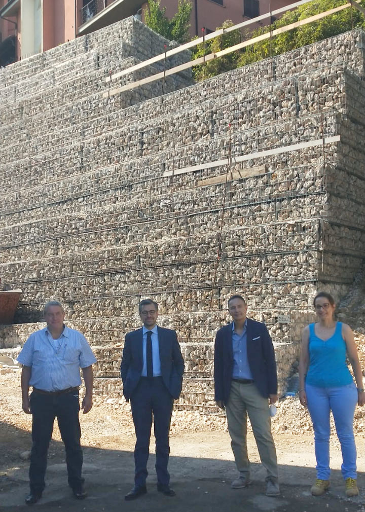 Erano presenti il Sindaco di Colleferro Pierluigi Sanna, il responsabile dell’Ufficio Tecnico comunale Ing. Mauro Casinelli, l’Ing. progettista Alessandra Spelta, il titolate dell’impresa (Tema Costruzioni Srl) che ha realizzato l’opera, Massimo Temperini, mentre per l’azienda produttrice dei gabbioni, la società cooperativa “Metallurgica Ledrense”, c’erano Alessandro Dalla Costa ed il Presidente Fabio Tiboni.