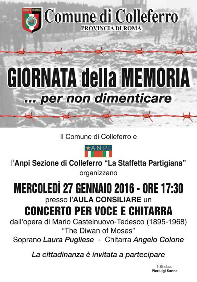 Nel pomeriggio di oggi, invece, in occasione della Giornata della Memoria, con il patrocinio dell’Amministrazione comunale, la locale sezione dell’Anpi ha organizzato un Concerto per voce e chitarra che si terrà nell’Aula consiliare a partire dalle ore 17,30 (<• click sulla locandina a lato).