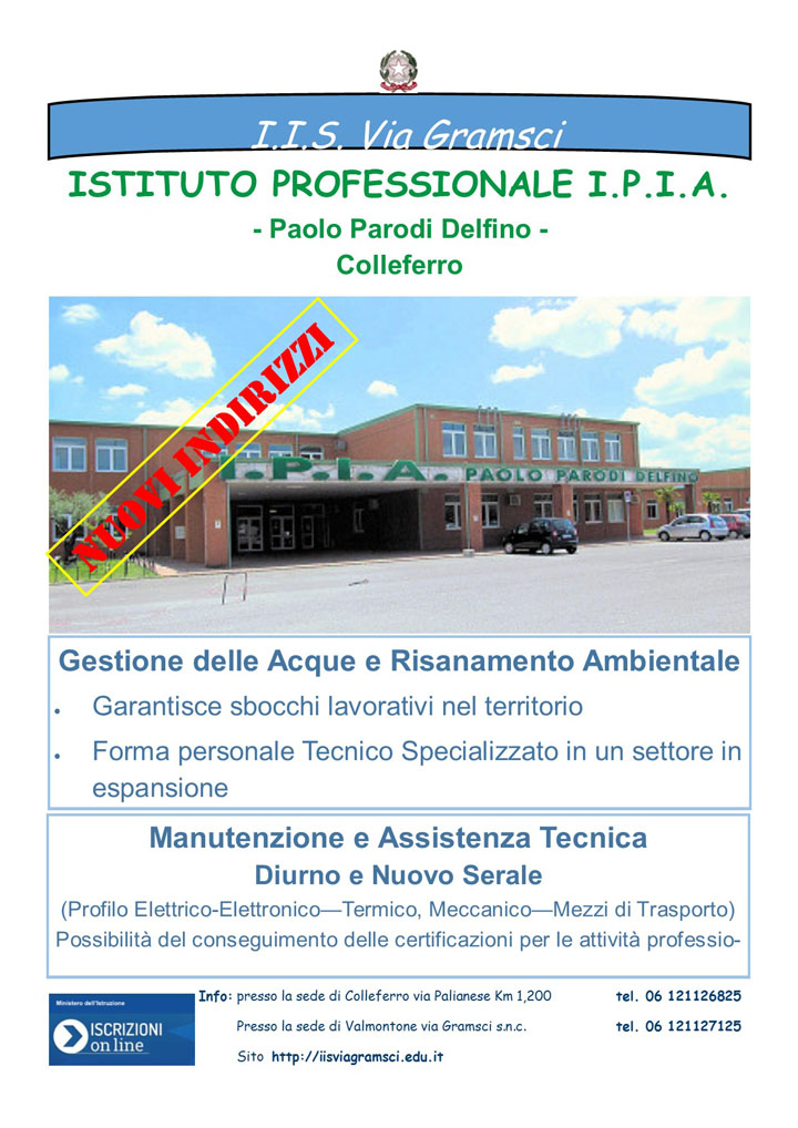Sono stati attivati nella sede dell’Istituto Professionale Ipia “Paolo Parodi Delfino” di Colleferro nuovi percorsi davvero innovativi e rispondenti alle richieste formative del territorio, come “Gestione delle acque e risanamento ambientale”, un indirizzo di studi che forma tecnici specializzati in un settore in forte espansione e di grande importanza, e il Corso serale di Manutenzione e Assistenza Tecnica, che permette il conseguimento del Diploma di Stato ad adulti che intendono migliorare la propria condizione lavorativa o che desiderano reinserirsi nel mondo del lavoro in maniera più qualificata.