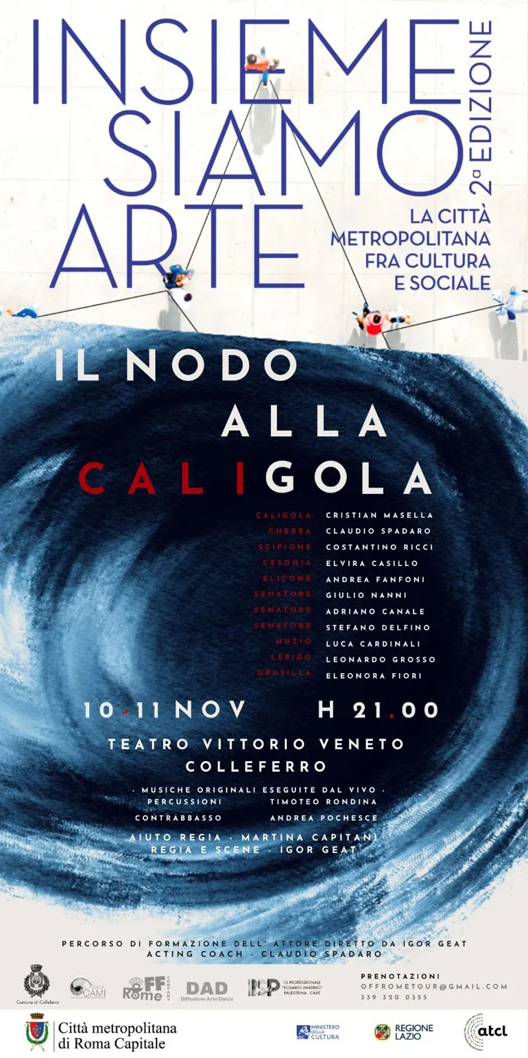 COLLEFERRO (Eledina Lorenzon) – Venerdì 10 e Sabato 11 Novembre alle ore 21, debutto al Teatro comunale Vittorio Veneto di Colleferro, nell’ambito della seconda edizione di “Insieme siamo Arte” di Atcl – Circuito Multidisciplinare del Lazio e Città metropolitana di Roma Capitale, Off Rome Tour, i suoi partners, e la Off Company, dello spettacolo “Il nodo alla Caligola”, libero adattamento dal “Caligola” di Albert Camus, con regia di Igor Geat, con musiche originali eseguite dal vivo dello spettacolo da Timoteo Rondina-percussioni e Andrea Pochesce-contrabbasso.