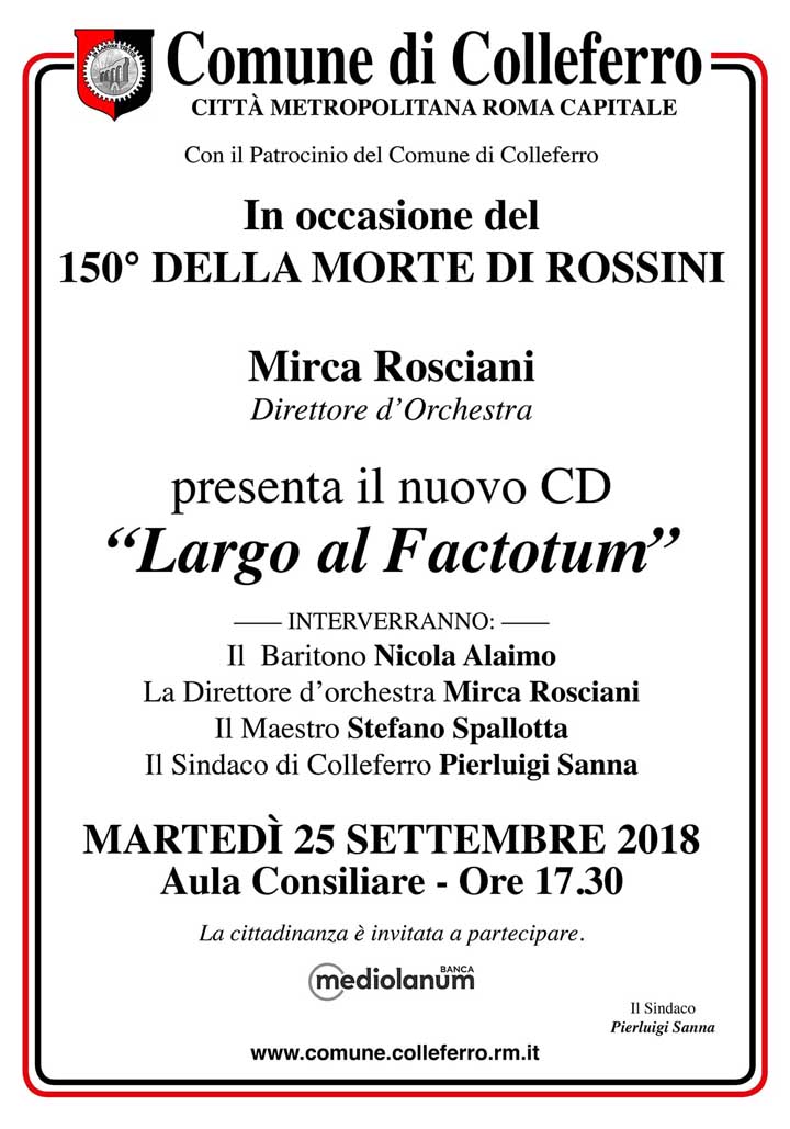 Il nuovo CD “Largo al Factotum” è stato realizzato in collaborazione con il Grande Baritono Nicola Alaimo – artista di fama mondiale e di riferimento del Rossini Opera Festival (Guillaume Tell, Matilde si Shabran, Il Barbiere di Siviglia, La Gazzetta, Torvaldo e Dorliska, Il Turco in Italia,concerti di Belcanto,la Cenerentola).