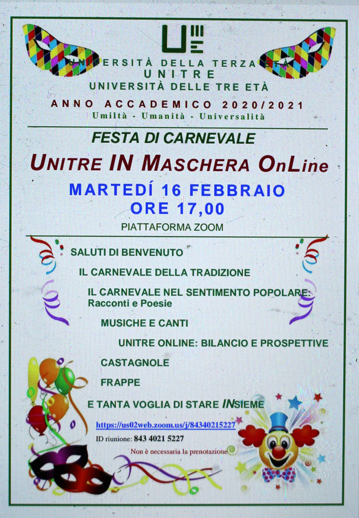 Per Martedi 16 Febbraio l’Unitre di Paliano organizza un appuntamento speciale per festeggiare, anche se distanti, questo Carnevale davvero particolare. Appuntamento alle ore 17.00 sulla piattaforma Zoom: