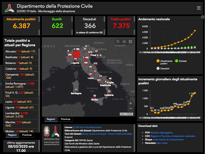 L’Italia è al 3° posto per numero di contagiati (7.375), al 3° per numero di guariti (622) ed al 2° per numero di morti (366).