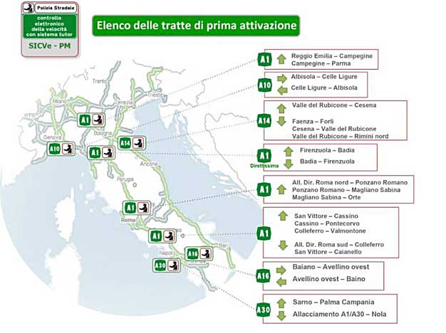 Il nuovo sistema per la rivelazione della velocità media sarà installato inizialmente su 22 tratte autostradali alle quali se ne aggiungeranno altre, attualmente in fase di valutazione (in neretto le tratte laziali – click sulla cartina per ingrandire):