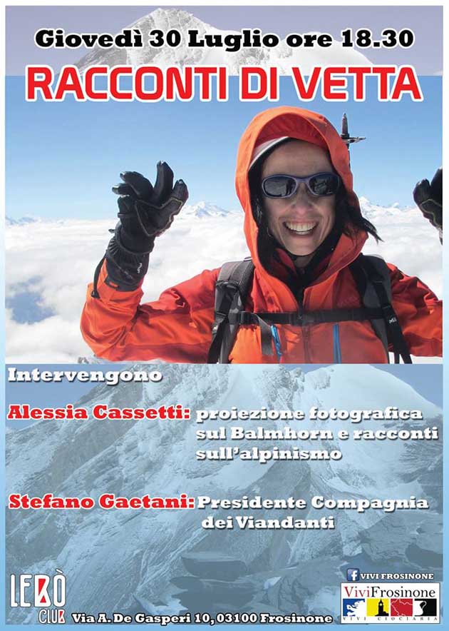 «Un appuntamento culturale – ha spiegato Alex Vigliani, presidente di Vivi Frosinone – che abbiamo cercato e voluto, poiché è forte l’attenzione che la nostra Associazione ha dato all’esperienza di Alessia Cassetti, raccontandola passo passo anche attraverso le foto che la stessa inseriva all’interno del proprio profilo personale. E poi, non di poco conto, è forte l’importanza che ViVi Frosinone dà alla montagna, alla spiritualità e al valore dell’ascensione come percorso formativo anche grazie alle esperienze con La Compagnia dei Viandanti ottimamente presieduta dall’amico Stefano Gaetani».