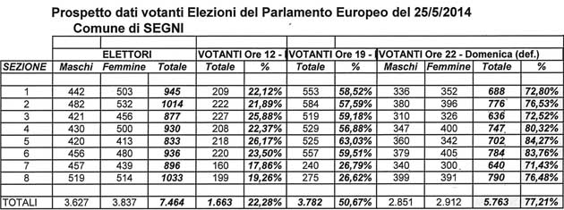 ELEZIONI EUROPEE 25 Maggio 2014. Comune di Segni. Affluenza alle urne definitivo 77,21%