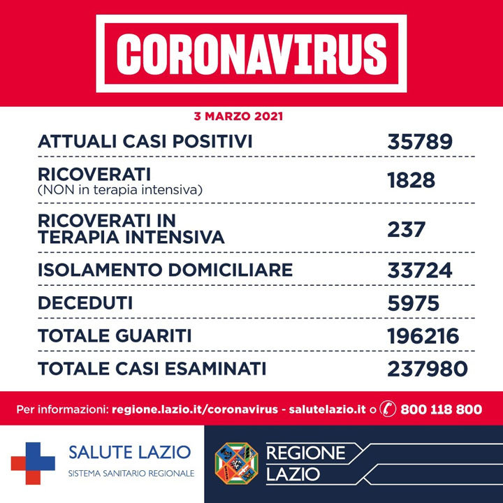 Oggi, 3 Marzo, su oltre 14mila tamponi nel Lazio (3.153) e quasi 23mila antigenici per un totale di oltre 37mila test, si registrano 1.520 casi positivi (+332), 35 i decessi (+6) e +1.491 i guariti.