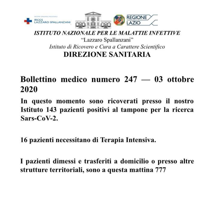 Questo è il Bollettino giornaliero dell’Istituto Nazionale di Malattie Infettive “Lazzaro Spallanzani”.