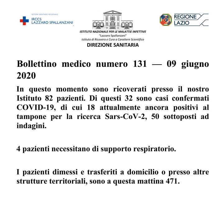 Oggi, 9 Giugno, si registra un dato di 23 casi positivi di cui 14 riferibili al focolaio dell’Irccs San Raffaele Pisana di Roma che raggiunge così un totale di 55 casi positivi.