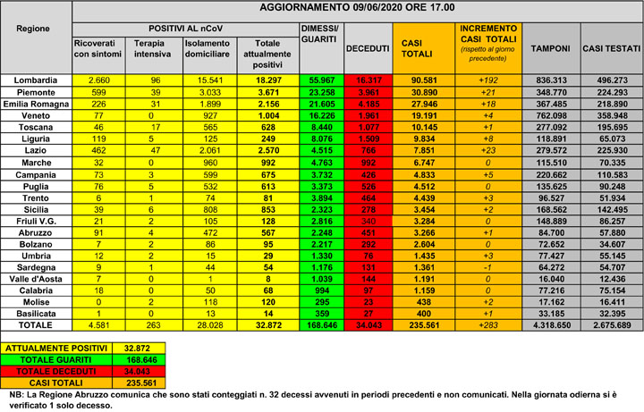 Dati Ultimo Aggiornamento: 09-06-2020 ore 18:00