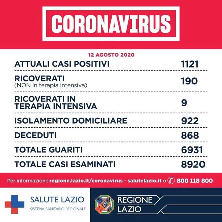 Emergenza Coronavirus. 12-8-2020. Ancora in crescita il dato nel Lazio: 38 nuovi casi positivi ed un decesso. Il Bollettino dello Spallanzani. Tutti i dati del contagio