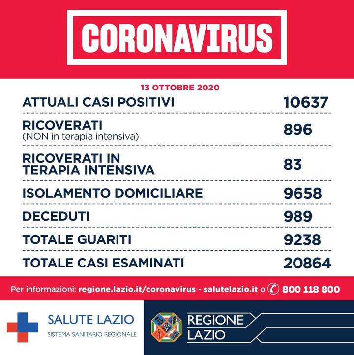 Oggi, 13 Ottobre, deciso balzo in avanti dei casi che sono 579 (a Roma 201) e forte incremento del numero dei tamponi effettuati, che sono oltre 15mila, 5 i decessi e 59 i guariti.