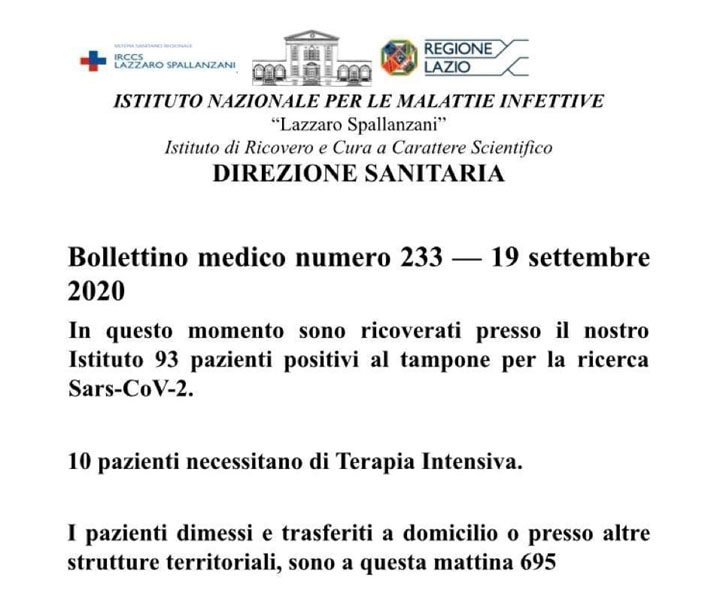 Questo è il Bollettino giornaliero dell’Istituto Nazionale di Malattie Infettive “Lazzaro Spallanzani”.