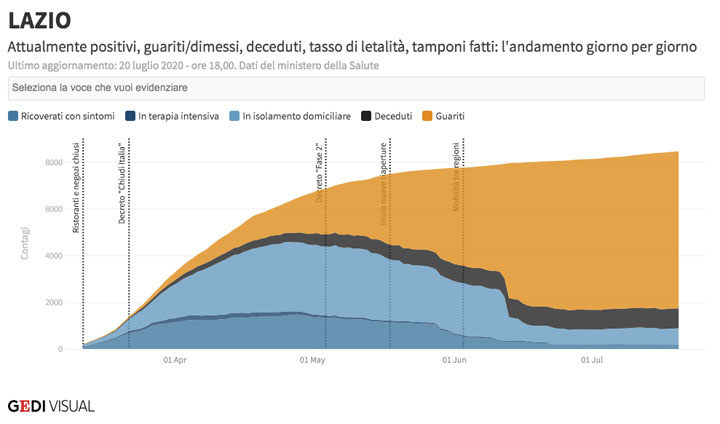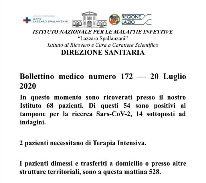 Emergenza Coronavirus. 20-07-2020. Nel Lazio 0 decessi. 9 ricoverati in terapia intensiva, 14 nuovi casi positivi dei quali 11 d’importazione. Tutti i dati del contagio