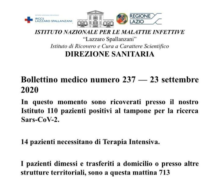 Questo è il Bollettino giornaliero dell’Istituto Nazionale di Malattie Infettive “Lazzaro Spallanzani”.