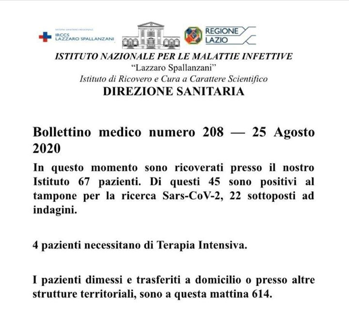 Bollettino medico numero 208 – 25 Agosto 2020