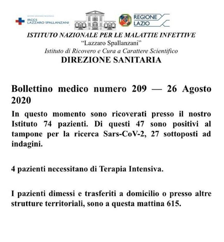 Bollettino medico numero 209 – 26 Agosto 2020