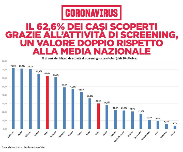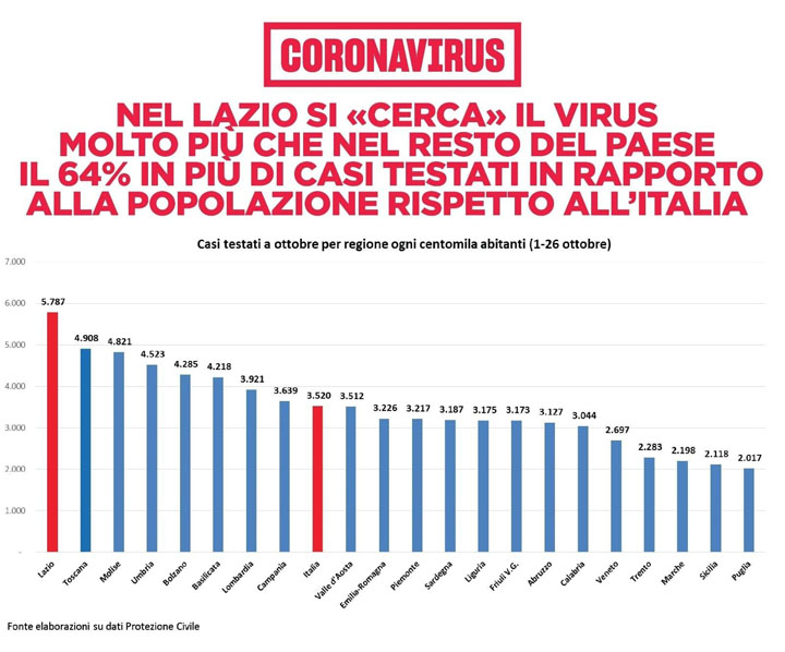 Il Lazio ha il 64% dei casi testati in rapporto alla popolazione in più rispetto alla media italiana