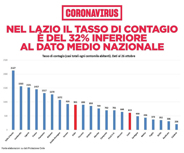 Nel Lazio il tasso di contagio è del 32% inferiore al dato medio nazionale