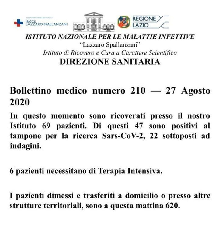 Bollettino medico numero 210 – 27 Agosto 2020