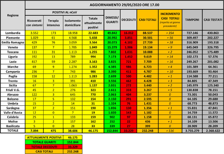 Questi i dati di oggi, 29 Maggio, relativi alla situazione