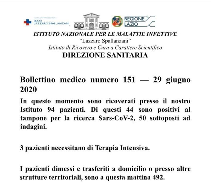 Emergenza Coronavirus. 29-06-2020. Nel Lazio 9 casi positivi e 0 decessi. 13 ricoverati in terapia intensiva e 17 guariti. Tutti i dati del contagio