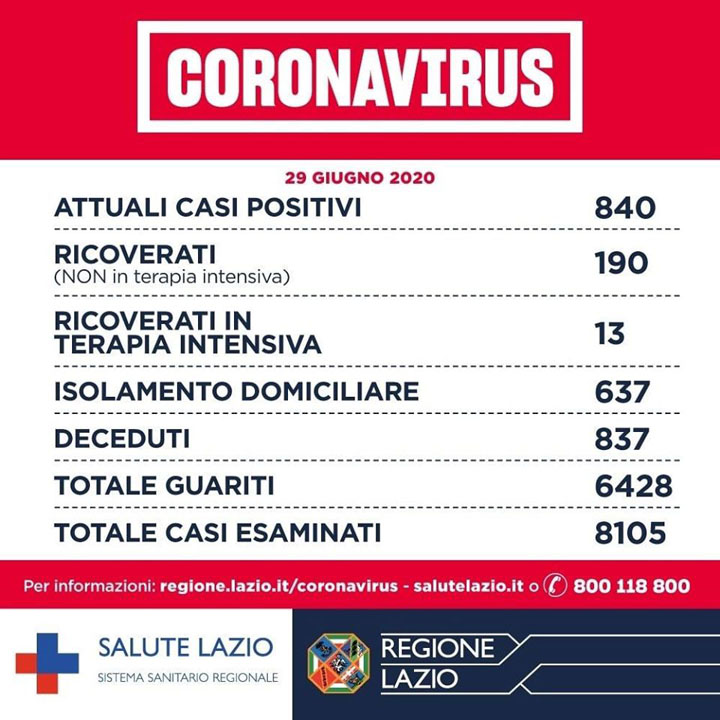 Sono 840 gli attuali casi positivi #COVID19 nella Regione Lazio. Di cui 637 sono in isolamento domiciliare, 190 sono ricoverati non in terapia intensiva, 13 sono ricoverati in terapia intensiva. 837 sono i pazienti deceduti e 6428 le persone guarite.