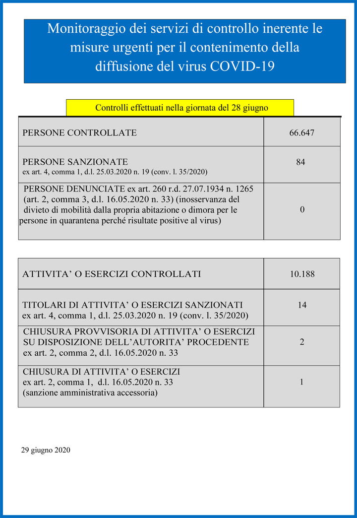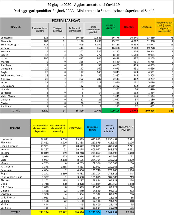 Dati Ultimo Aggiornamento: 29-06-2020 ore 18:00