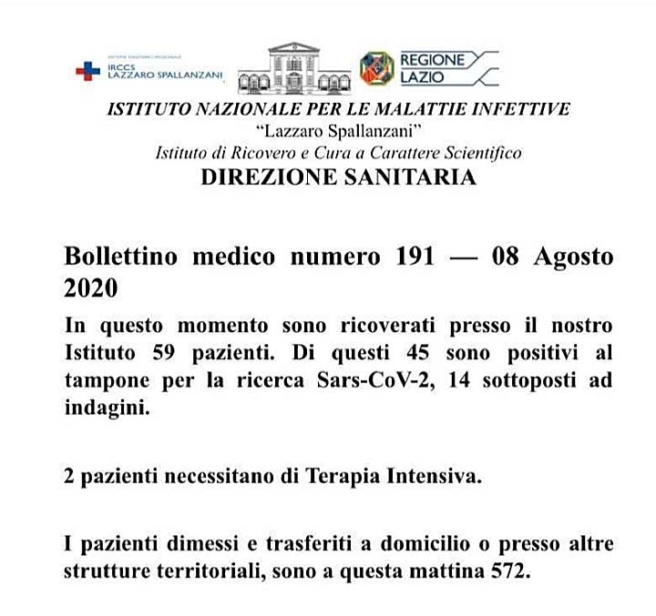 Bollettino medico numero 191 – 8 Agosto 2020