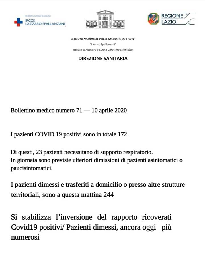 Pubblichiamo il Bollettino giornaliero dell’Istituto Nazionale di Malattie Infettive “Lazzaro Spallanzani”.