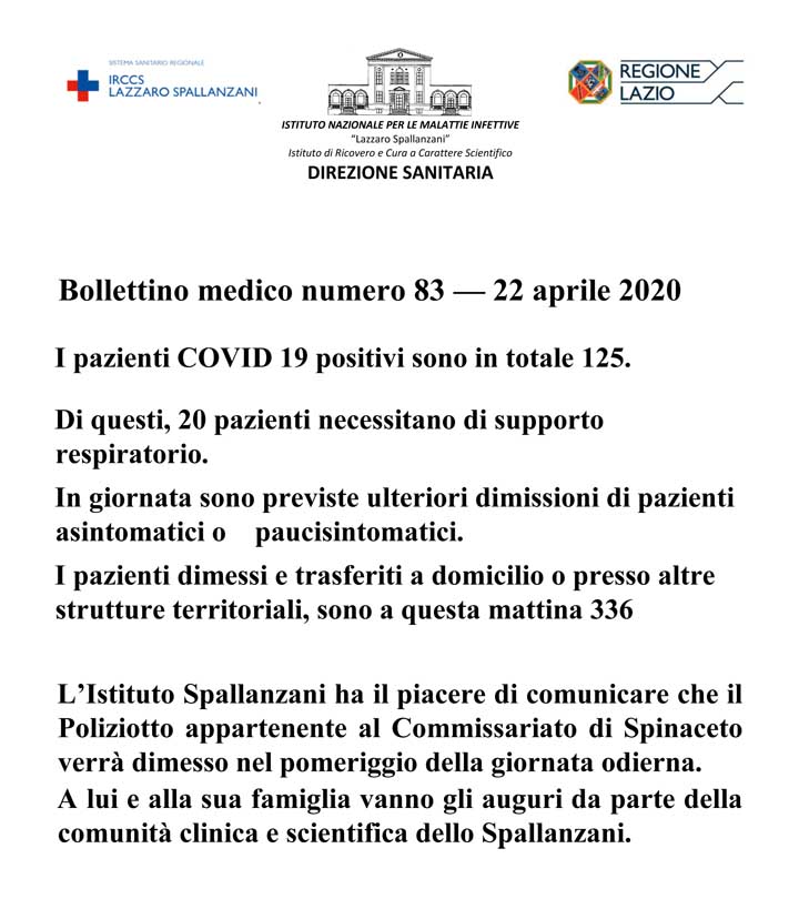 Emergenza Coronavirus. Bollettino n. 83 del 22 Aprile dell’Inmi “Lazzaro Spallanzani”. Calano i positivi ed aumentano i guariti