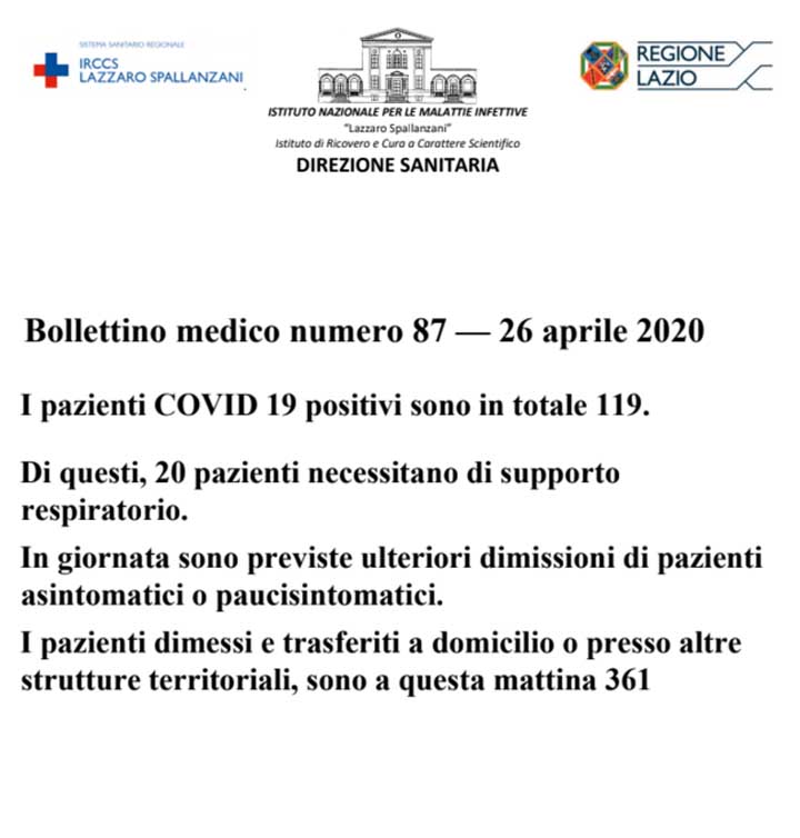 Emergenza Coronavirus. Bollettino n. 87 del 26 Aprile dell’Inmi “Lazzaro Spallanzani”. 119 pazienti positivi, 20 in terapia intensiva, 3 guariti