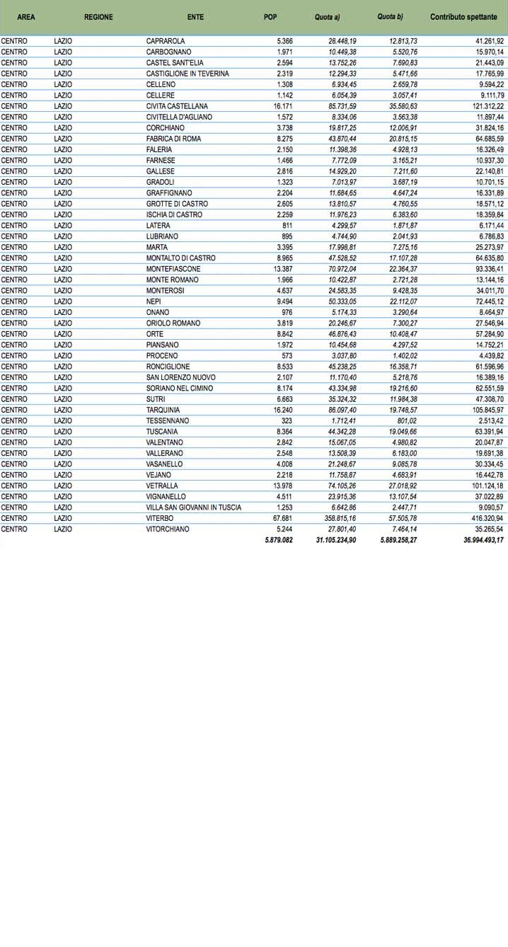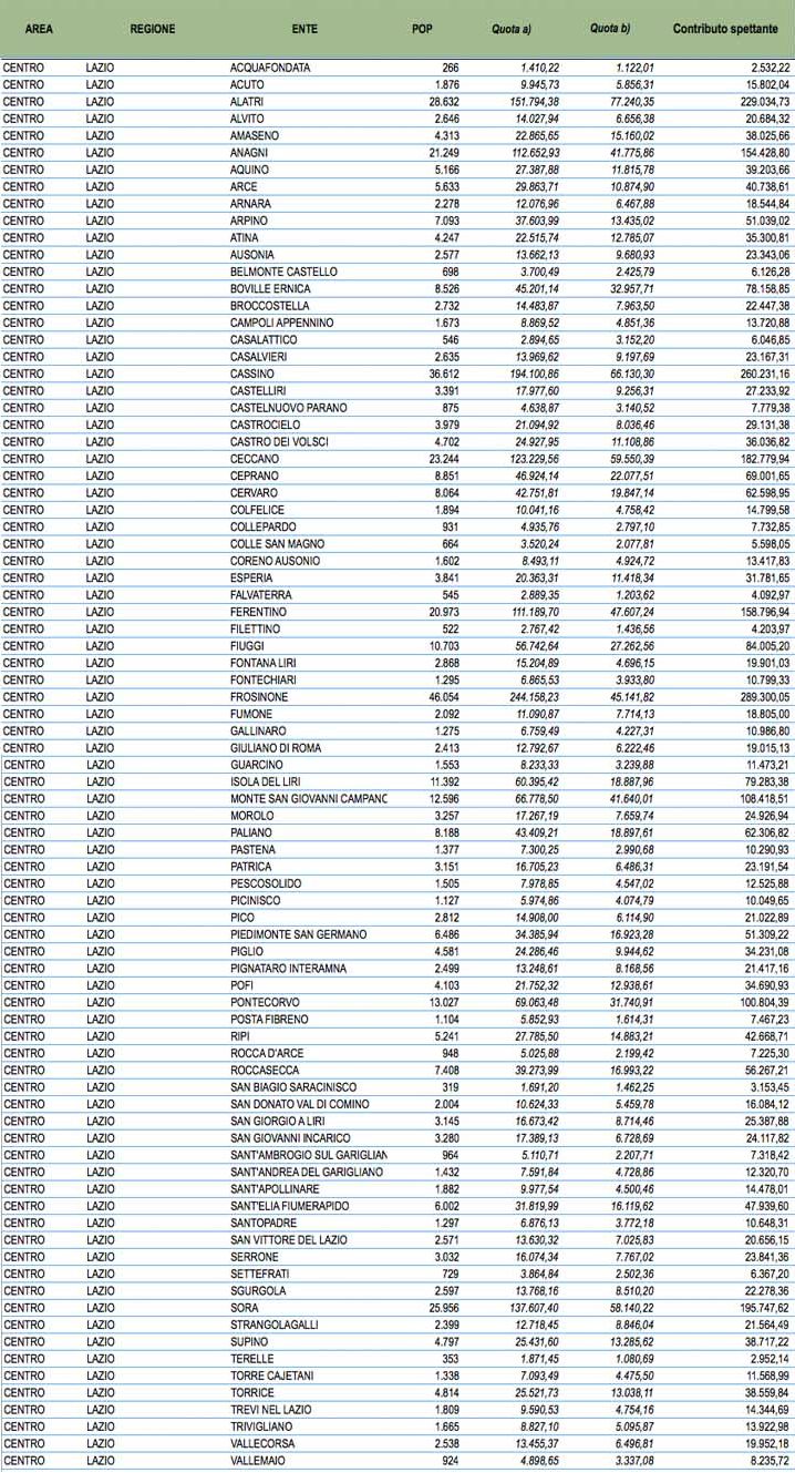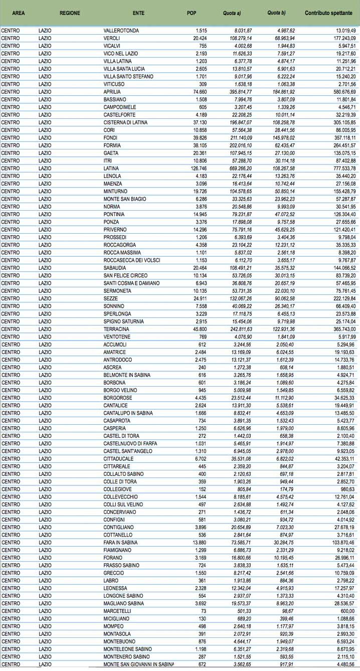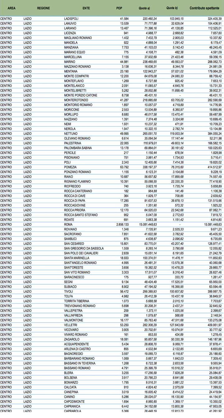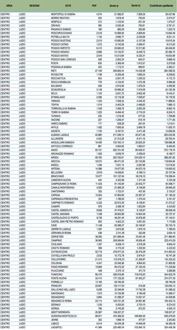 Pubblichiamo di seguito la ripartizione per i Comuni del Lazio, 36.994.493.17 euro (disponibile anche a questo link •>).