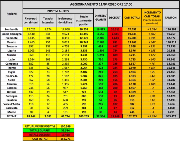 Questi i dati di oggi, 11 Aprile, relativi alla situazione