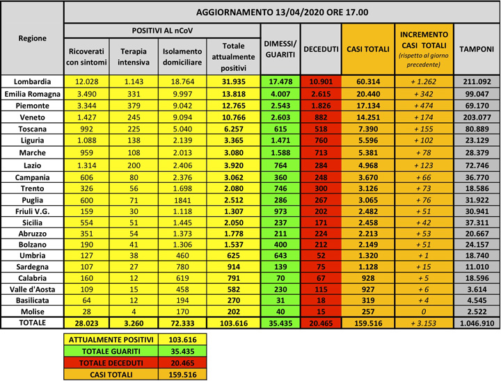 Questi i dati di oggi, 13 Aprile, relativi alla situazione