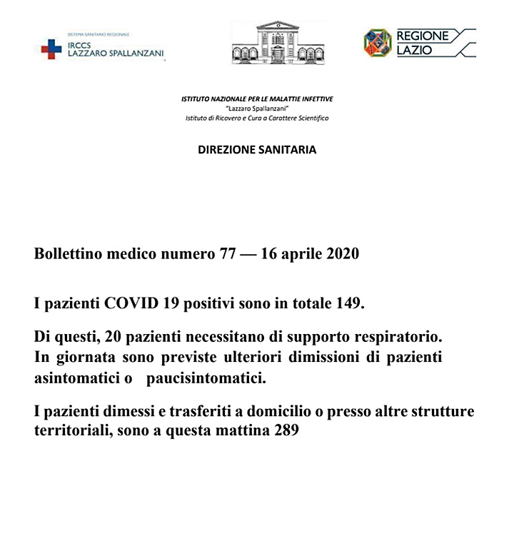 Policlinico Umberto I – 133 pazienti ricoverati di cui 17 in terapia intensiva. 7 pazienti sono guariti