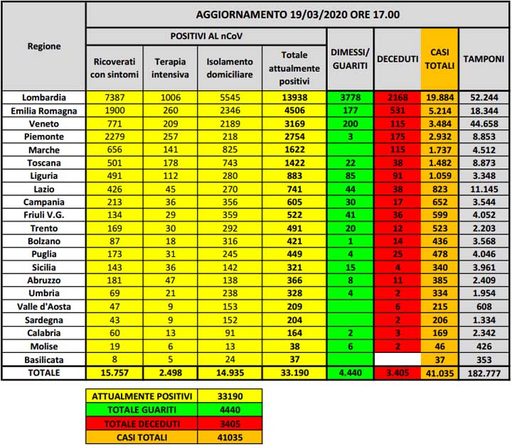 Dati Ultimo Aggiornamento: 19-03-2020 ore 18:00