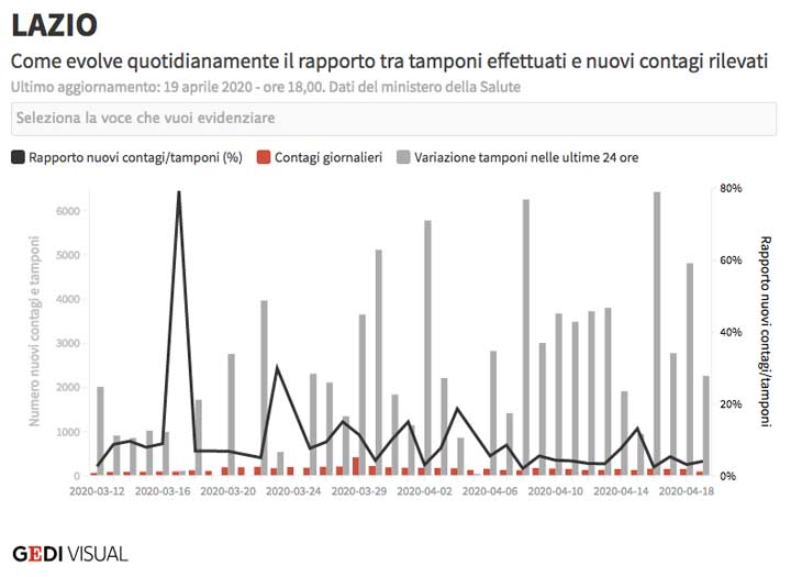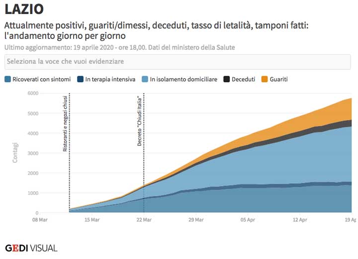 Oggi, 19 Aprile, sono 4321 gli attuali casi positivi Covid19 nella Regione Lazio. Di cui 2766 sono in isolamento domiciliare, 1370 sono sono ricoverati non in terapia intensiva, 185 sono ricoverati in terapia intensiva.