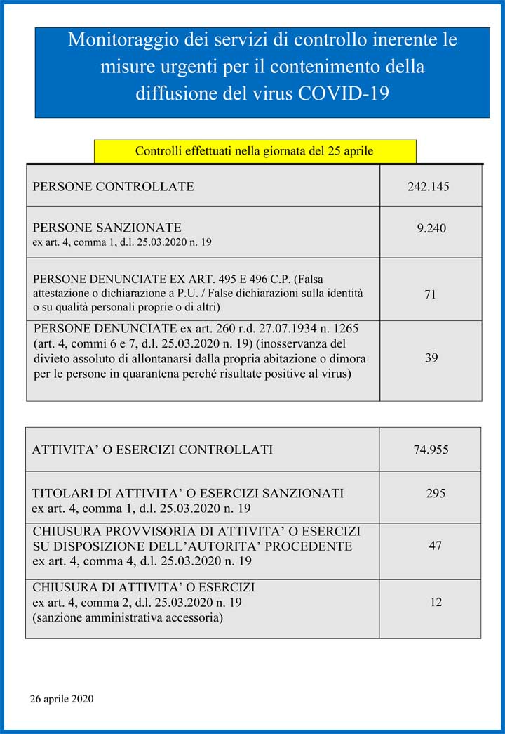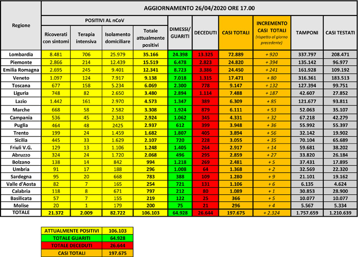 Questi i dati di oggi, 26 Aprile, relativi alla situazione