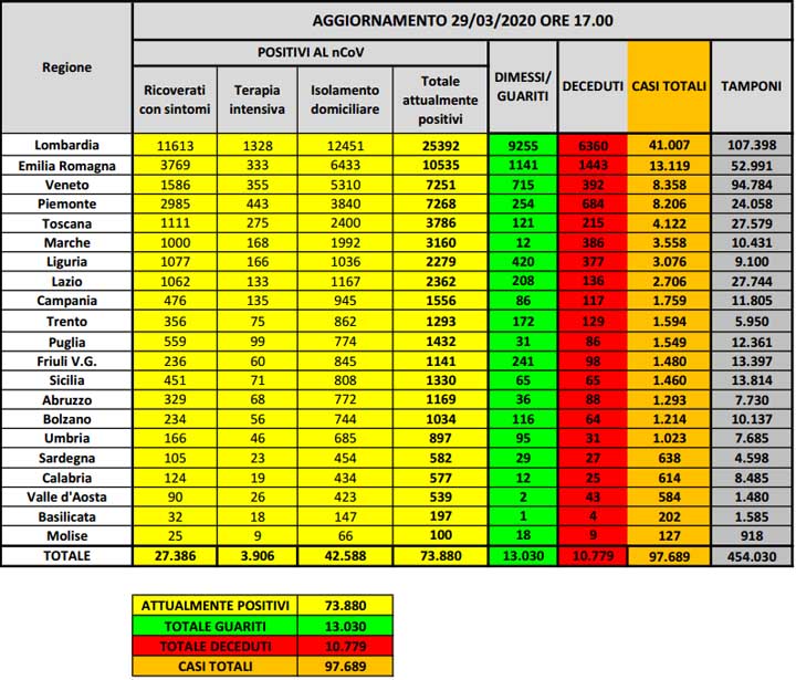 Dati Ultimo Aggiornamento: 29-03-2020 ore 18:00