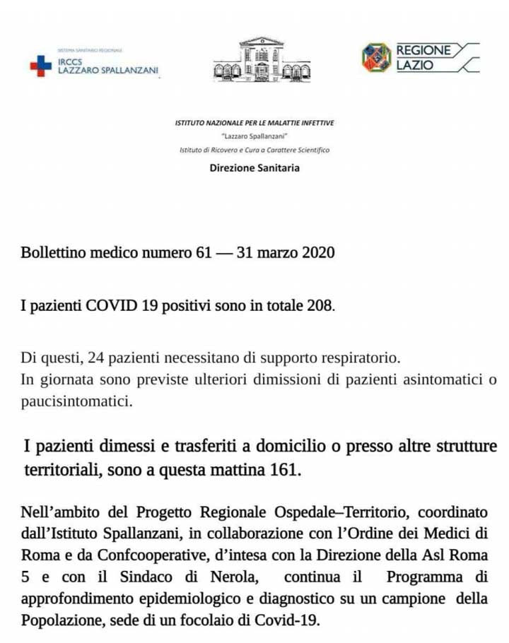 Emergenza Coronavirus. #IORESTOACASA. 31-03-2020. I dati del contagio nel Lazio. Tutte le informazioni utili