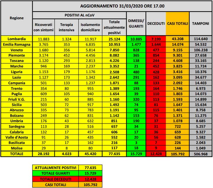 Dati Ultimo Aggiornamento: 31-03-2020 ore 18:00