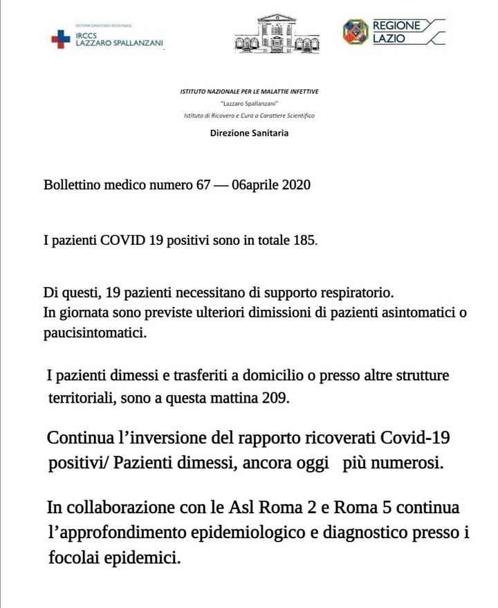 Emergenza Coronavirus. #IORESTOACASA. 6-04-2020. I dati del contagio nel Lazio. Tutte le informazioni utili