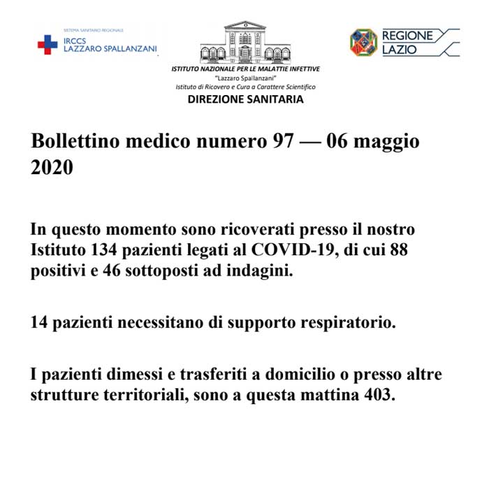 Emergenza Coronavirus. Lo Spallanzani in “Fase3”. Pazienti in terapia intensiva (-1). Ricoverati (-11). Guariti (+5). Questo il Bollettino n. 97 del 6 Maggio