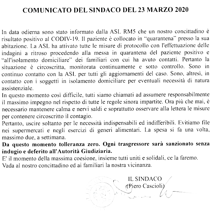 Città Metropolitana di Roma Emergenza Coronavirus. Un caso oggi, 23 Marzo, anche a Segni. È stato posto in “quarantena” ed i familiari sono in isolamento domiciliare 23 Marzo 2020 Redazione Cronaca, Emergenza Coronavirus, nuovi contagi, olleferro, positivo al Covid19, ricoverato, Roma, Sanità, Segni SEGNI – Un caso di positività al virus Covid-19 è stato registrato nella giornata di oggi, 23 Marzo, anche a Segni Lo ha annunciato il sindaco di Segni.
