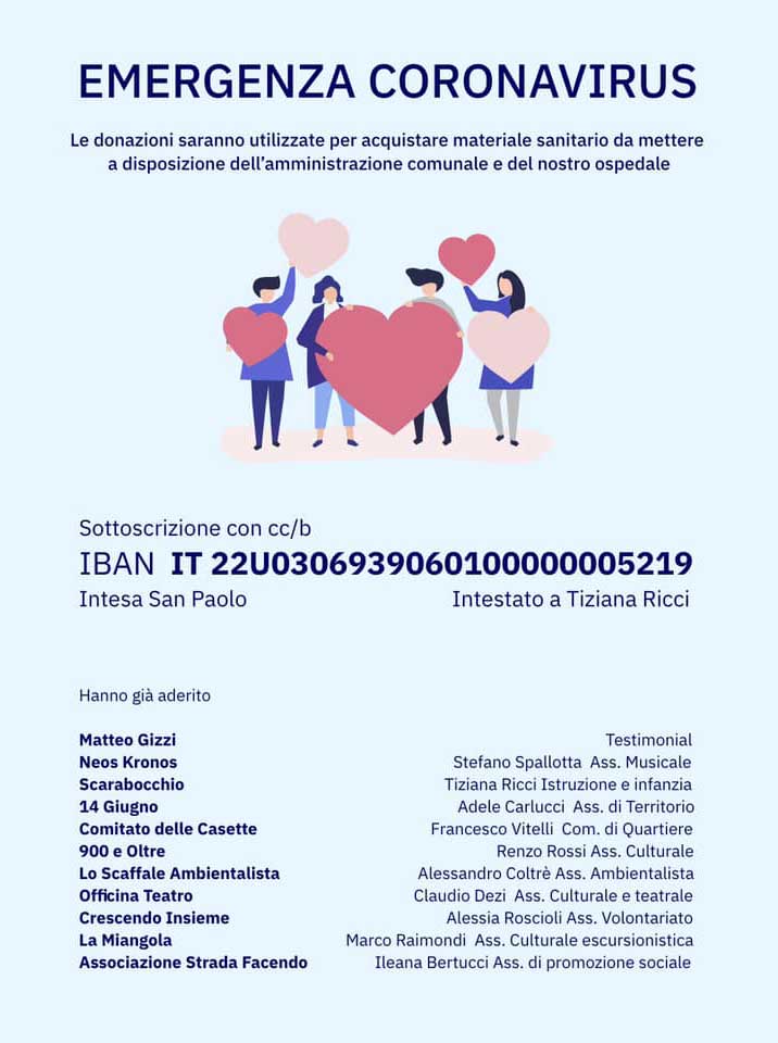COLLEFERRO | SEGNI (Eledina Lorenzon) – Numerose associazioni di Colleferro quali Neos Kronos, Scarabocchio, 14 Giugno, Comitato Le Casette, 900 e Oltre, Lo Scaffale Ambientalista, Officina Teatro, Crescendo Insieme, Strada Facendo e di Segni come La Miangola, si sono attivate sul fronte emergenza coronavirus, proponendo una raccolta fondi per acquistare materiale sanitario sia per l’Azienda Ospedaliera di Colleferro che per l’Amministrazione Comunale.