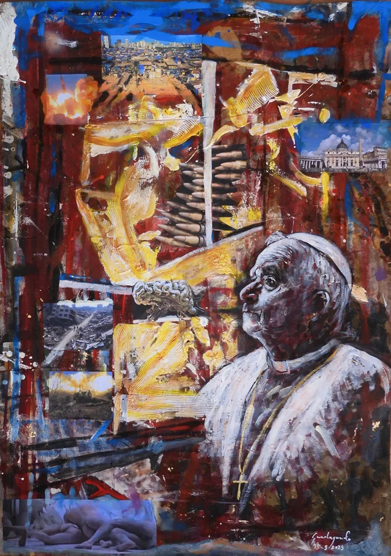 Le pennellate dinamiche e la struttura fluida della composizione trasformano il ritratto in un invito a riflettere sul ruolo perpetuo della fede nella gestione delle crisi contemporanee, ponendo l’accento sulla necessità di un’azione che sia al contempo spirituale e fortemente radicata nella realtà sociale. Il dipinto diventa, dunque, un simbolo potente: la luce della spiritualità si fa guida in un’epoca di innovazione, suggerendo come il dialogo tra dimensioni apparentemente opposte possa condurre a una società più giusta, inclusiva e orientata alla Pace.