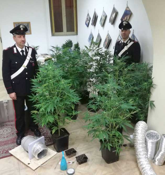 I militari operanti, a seguito di perquisizione domiciliare, rinvenivano, in una stanza predisposta a serra, 15 piante di marjuana del peso complessivo Kg.7,5, oltre a materiale utile per il confezionamento.