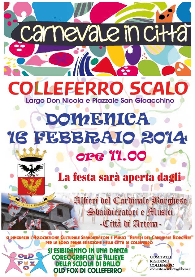 «Festa di carnevale in città, a Colleferro Scalo, Domenica 16 febbraio, dalle ore 11.00, in largo don Nicola e piazzale san Gioacchino, una speciale occasione di distrazione per tutti, in particolare per i bambini, che potranno travestirsi con quanto di fantasia troveranno nella Casa delle Maschere, farsi truccare e pettinare da amiche bravissime, tra coriandoli, castagnole calde, musica e balli.
